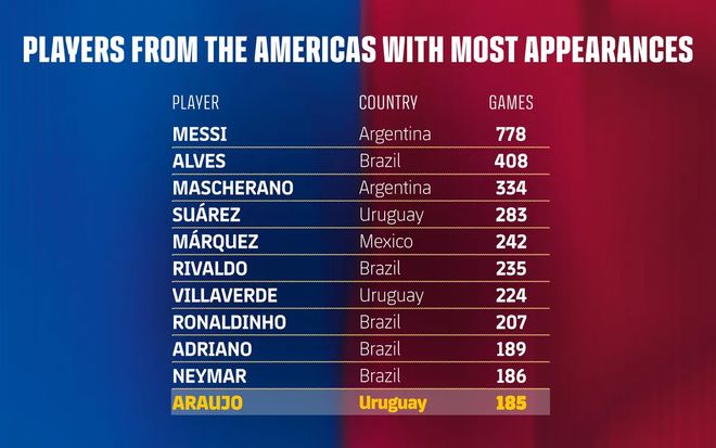 雷速体育10月30日讯 根据巴塞罗那俱乐部官方的消息,乌拉圭后卫阿劳霍只差1场比赛,就能跻身巴塞罗那队史美洲球员出场次数前十。