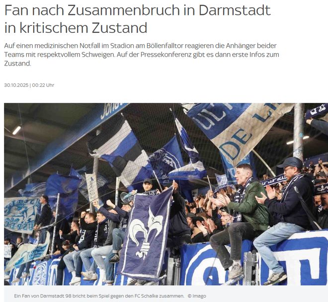 德媒:达姆施塔特vs沙尔克一役中有球迷昏迷,目前情况危急