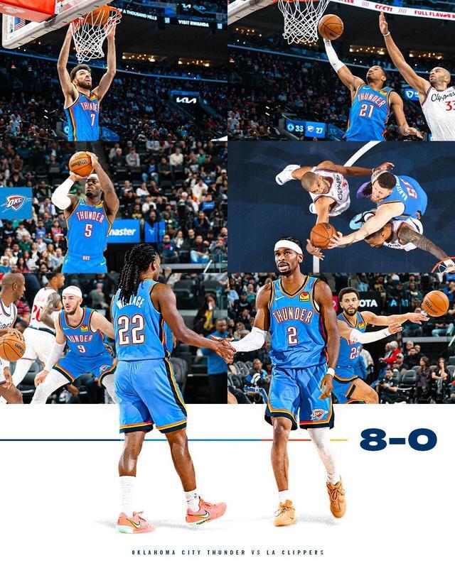 本场比赛过后,雷霆本赛季的战绩来到8胜0负,这也创造了他们队史的最佳开局纪录。赛后,雷霆官方社媒分享了队史最佳开局的纪念海报。(NBA官网)
