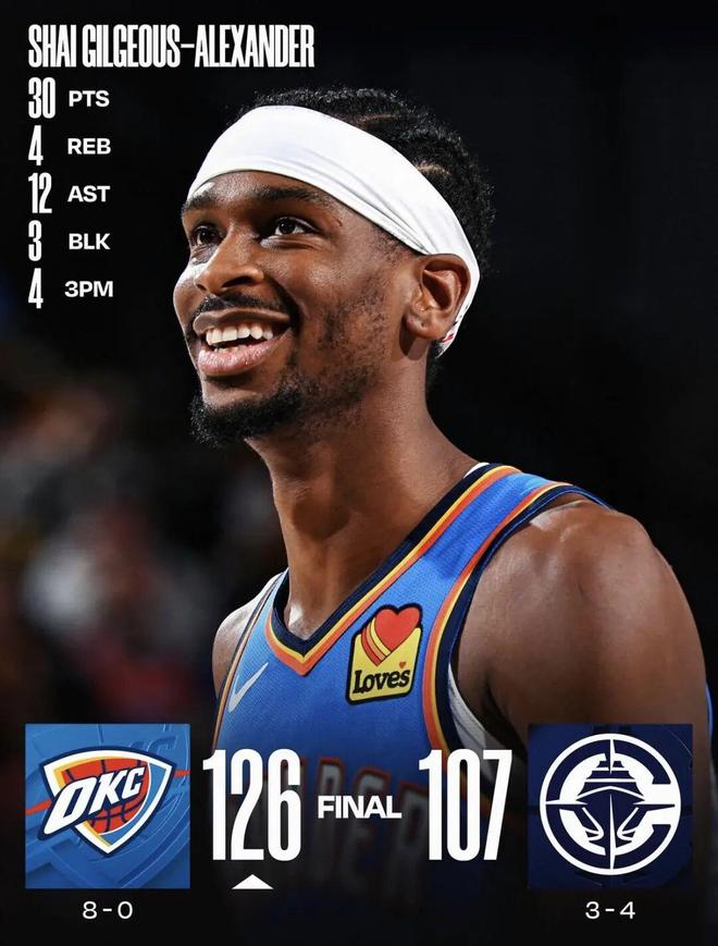 拿下这场比赛之后,卫冕冠军雷霆本赛季的战绩来到8胜0负,100%的胜率继续稳坐全联盟第一。而SGA亚历山大在面对老东家时打出了完美的表现,不仅帮助球队赢得了胜利,更是在收获单场30分的同时迎来个人里程碑,这是他连续第80场比赛得分超过20分,这让他超越“大O”奥斯卡·罗伯特森位列历史第三,排名前两位的纪录均由“上古大神”张伯伦创造,分别是92场和126场,如果SGA的状态足够稳定,那么这一纪录极有可能在本赛季被打破。