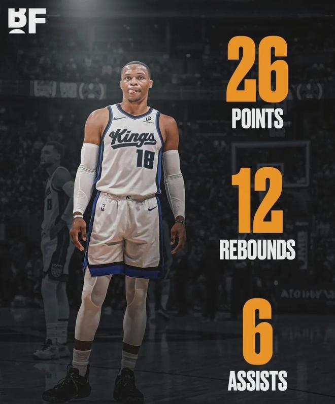 国王124-130不敌掘金,此役威少以首发大前锋身份出战,面对老东家打出本赛季最强一战,约37分钟时间里,投篮17中10,其中三分球6中3,罚球3中3砍下26分12板6助2断炸裂数据。